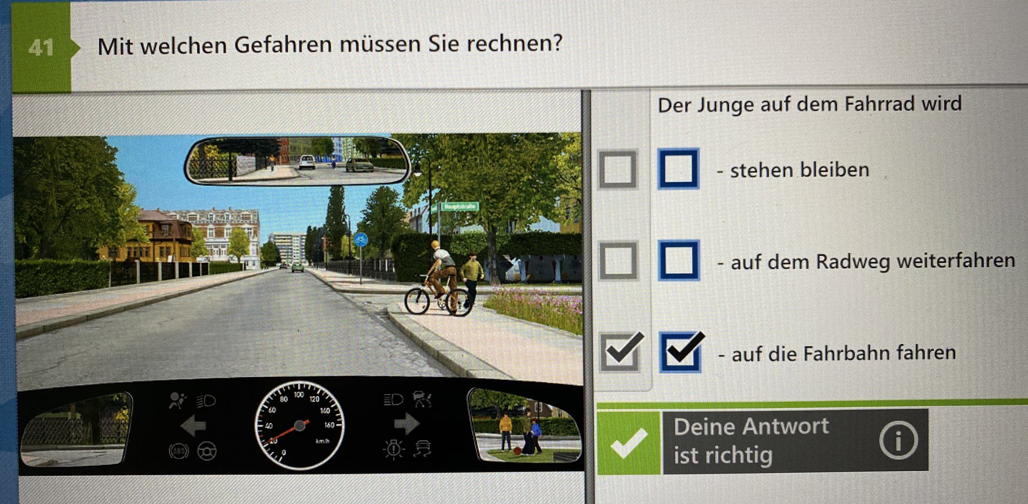 Mit welchen Gefahren müssen Sie rechnen. 1 - auf die Fahrbahn fahren 2 - auf dem Radweg weiterfahren 3 - stehen bleiben Frage.